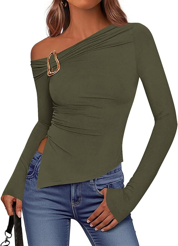 This top is such a confidence booster. The off-the-shoulder asymmetrical neckline gives it a trendy Y2K vibe while still feeling modern and wearable. The fabric is soft, stretchy, and hugs your shape nicely without feeling restrictive.