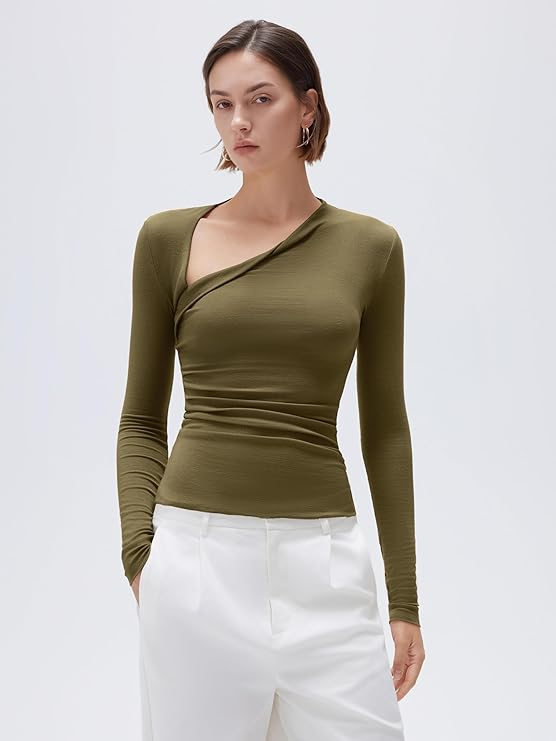 This top feels incredibly light and soft on the skin. The modal cashmere blend is breathable yet cozy, making it perfect for fall transitions. The asymmetric neckline adds a stylish edge to an otherwise simple long-sleeve tee.